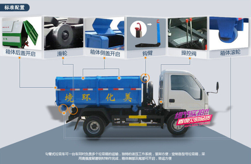 鉤臂垃圾車又稱為車廂可卸式垃圾車,用全液壓控制操作系統(tǒng),垃圾廂與底盤可徹底分離,具有結(jié)構(gòu)合理,操作簡(jiǎn)便、穩(wěn)定、使用效率高、密封性能好、傾倒方便等優(yōu)點(diǎn),能實(shí)現(xiàn)一臺(tái)車與多個(gè)垃圾廂聯(lián)合作業(yè),循環(huán)運(yùn)輸,充分提高車輛的運(yùn)輸能力。主要適用于市政環(huán)衛(wèi)、物業(yè)管理、大型廠、工礦等各種場(chǎng)所收集、運(yùn)載各種垃圾。