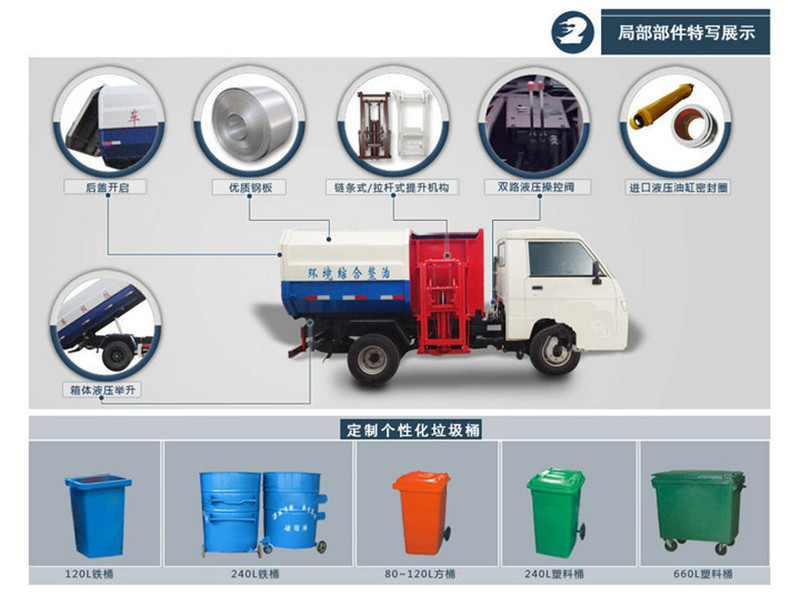 掛桶垃圾車又名自裝卸式垃圾車, 由密封式垃圾廂、液壓系統(tǒng)、操作系統(tǒng)組成。舉升油制缸垃圾廂可自吊上放下,上下一次工作循環(huán)時(shí)間≤50s。一輛車可配幾十個(gè)垃圾桶,實(shí)現(xiàn)一臺(tái)車與多個(gè)垃圾桶聯(lián)合作業(yè),循環(huán)運(yùn)輸,充分提高了車輛的運(yùn)輸能力,特別適用于短途運(yùn)輸,如環(huán)衛(wèi)部門對(duì)城鎮(zhèn)垃圾的清理、運(yùn)輸?shù)?/span>。