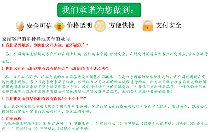 | 2、購(gòu)車流程: | 1、咨詢洽談(電話洽談或來(lái)廠考察洽談) 2、簽訂汽車購(gòu)銷合同(傳真、郵遞或者來(lái)廠簽訂) 3、我廠按時(shí)按質(zhì)生產(chǎn) 4、交付驗(yàn)收 >>點(diǎn)擊查看詳細(xì)內(nèi)容 |