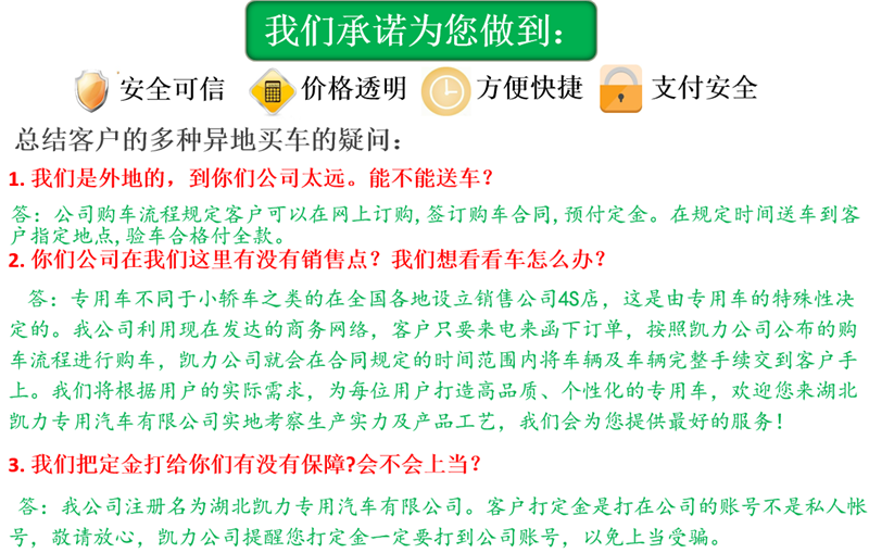 | 2、購(gòu)車流程: | 1、咨詢洽談(電話洽談或來廠考察洽談) 2、簽訂汽車購(gòu)銷合同(傳真、郵遞或者來廠簽訂) 3、我廠按時(shí)按質(zhì)生產(chǎn) 4、交付驗(yàn)收 >>點(diǎn)擊查看詳細(xì)內(nèi)容 |